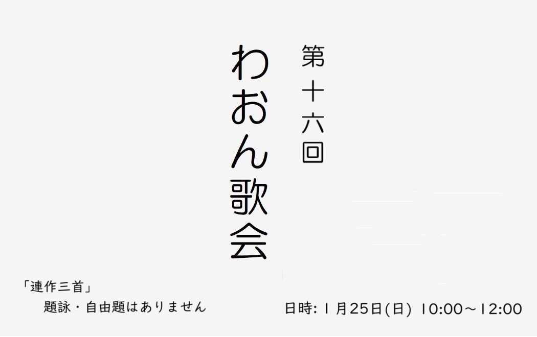 「わおん歌会」のご案内です。第16回は1月25日(日)の開催です。今回は、初の試み「連作三首」に挑戦します。題詠・自由題はありませ…