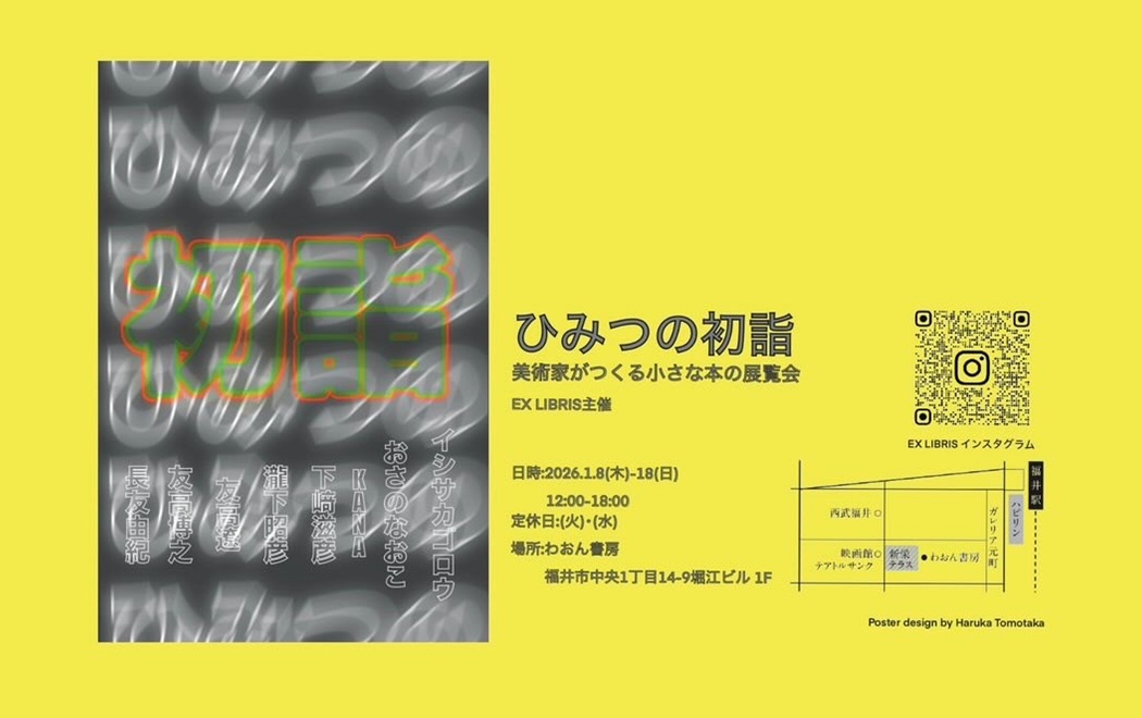 【開催概要】 ・会期:2026年1月8日(木)~18日(日) 12:00~18:00 ・場所:わおん書房(ギャラリースペース) *観覧無料 ・参加作家:イシサカゴロウ・おさのなおこ・KANA・下﨑滋彦・瀧下昭彦・友高遼・友高博之・長友由紀 |