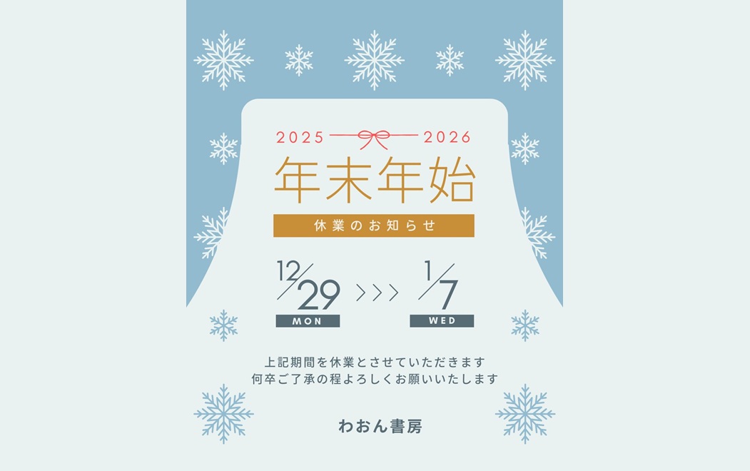 年末年始休業のお知らせ 2025.12.24 お知らせ 年内の営業は28日(日)までとなります。 12月29日(月)~1月7日(水)までお休みをいただき、年始は8日(木)から営業します(営業時間12:00~18:00 火・水曜定休)。 オンラインショップは、年内12月28日(日)受付分まで年内に発送します。 年始の発送は1月8日(木)からとさせていただきます。 よろしくお願いいたします。